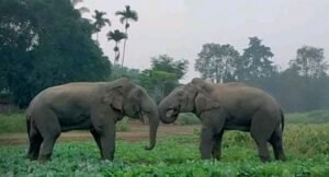वही दो जंगली हाथी कई दिनों से अपने में लड़ते लड़ते खेती से रास्ते पे आ जाती है जो लोग देखने और खेदड़ने के लिए भीड़ लगा देते है ऐसा मालूम चल रहा है कि काजीरंगा पार्क में जिस तरह लोग जंगली जानवर देखने जाते थे अब यही आएंगे ।